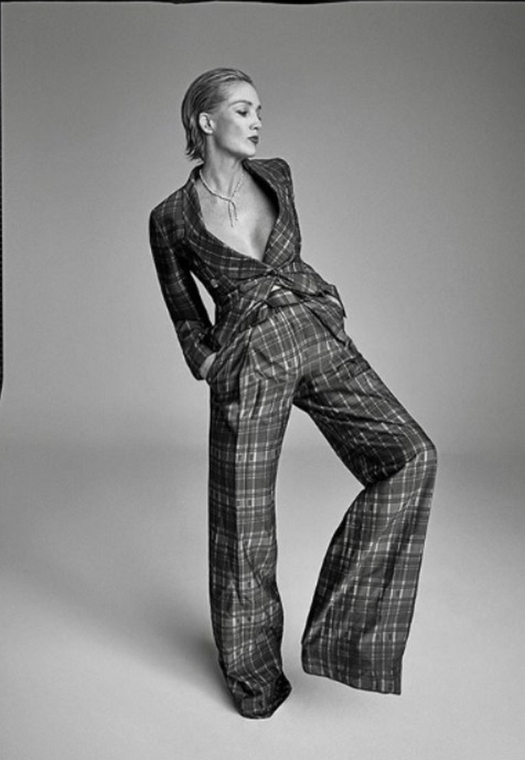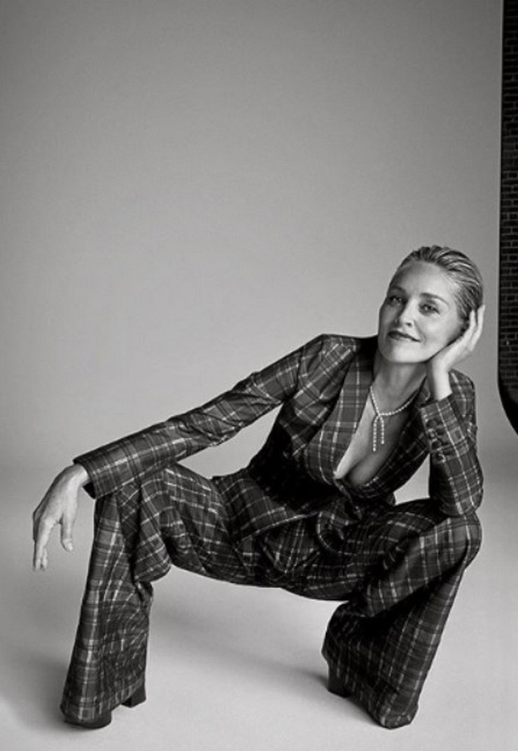 60-няя Шэрон в очередной раз примерила на себя образ страстной обольстительницы, создав его при помощи одежды трендовых марок. Все фотоснимки выполнены в черно-белой гамме. В черном платье от Versace знаменитость продемонстрировала стройные ножки, соблазнительный вырез в области груди и точеную талию. Также Стоун примерила костюм Gabriela Hearst в клетку с широкими брюками и глубоким декольте и тренч в классическом стиле The Row.