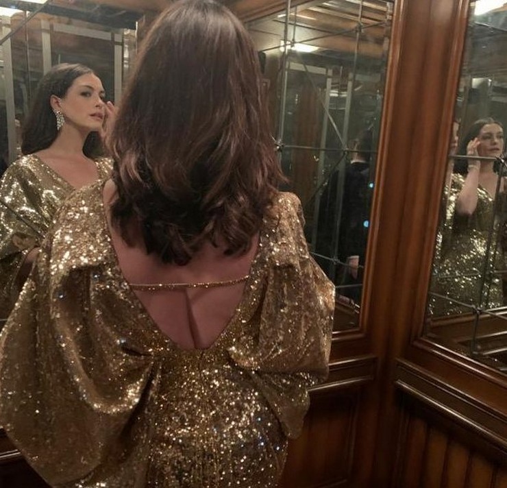 В облегающем блестящем платье золотого цвета с глубоким декольте и рукавами кроя “летучая мышь” актриса появилась на церемонии. Фотоснимком в роскошном наряде, сделанном в лифте, Энн поделилась у себя в Инстаграме. “Я вернулась”, – такой комментарий оставила знаменитость под постом. Стоит отметить, что в последнее актриса очень редко появлялась в соцсетях. Один из последних ее постов был посвящен ее 37-летия. На селфи актриса показала себя с большим животиком и засняла свои подарки.