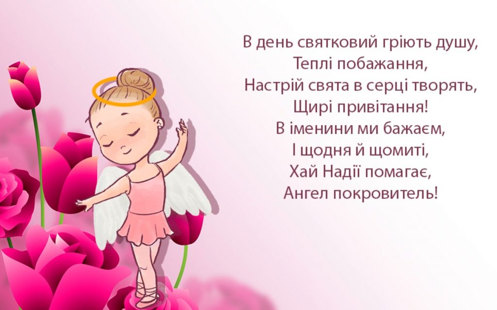 – Надіє, твій Ангел сьогодні поруч з тобою! Нехай він оберігає від усіх життєвих бур, допомагає у важливих справах та дарує світлу надію у серці. Щастя, гармонії та любові тобі!