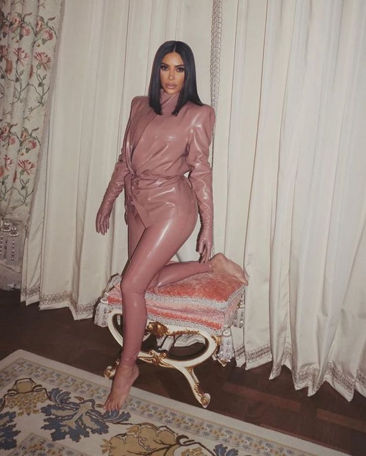 На кадрах на Ким латексный костюм цвета пыльной розы и вьетнамки на каблуках. Она похоже позирует в гостиничном номере. Стоит отметить, что в похожем наряде выходила в свет и старшая сестра Ким – Кортни.