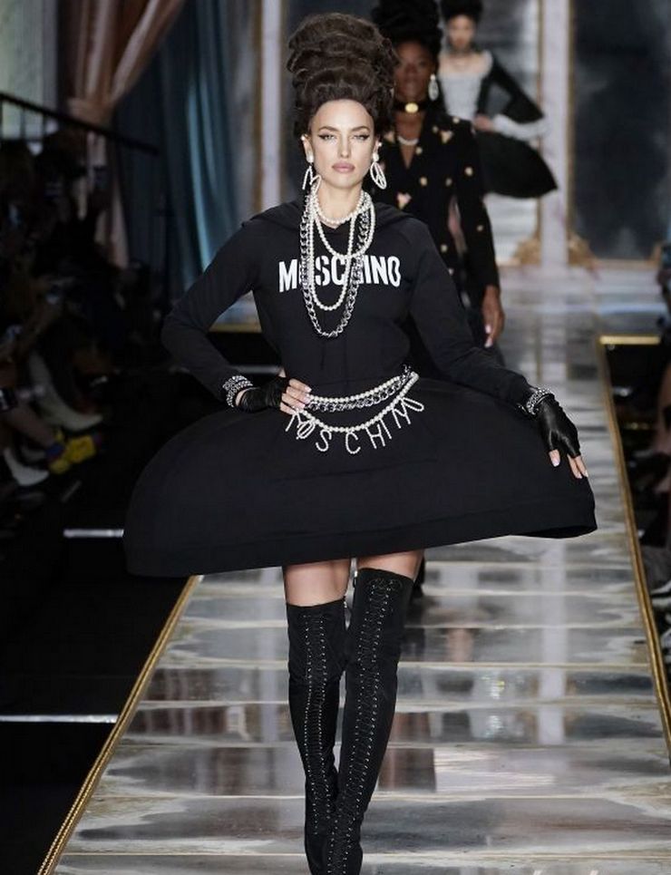 Как сообщает Plitkar со ссылкой на сайт “ТСН”, Ирина дефилировала на показе Moschino в черном коротком платье, ботфордах со шнуровкой. Образ Ирины дополнен большим количеством крупных аксессуаров. Также знаменитость участвовала в презентации коллекции сумочек Furla. Здесь она уже предстала в совершенно другом образе.