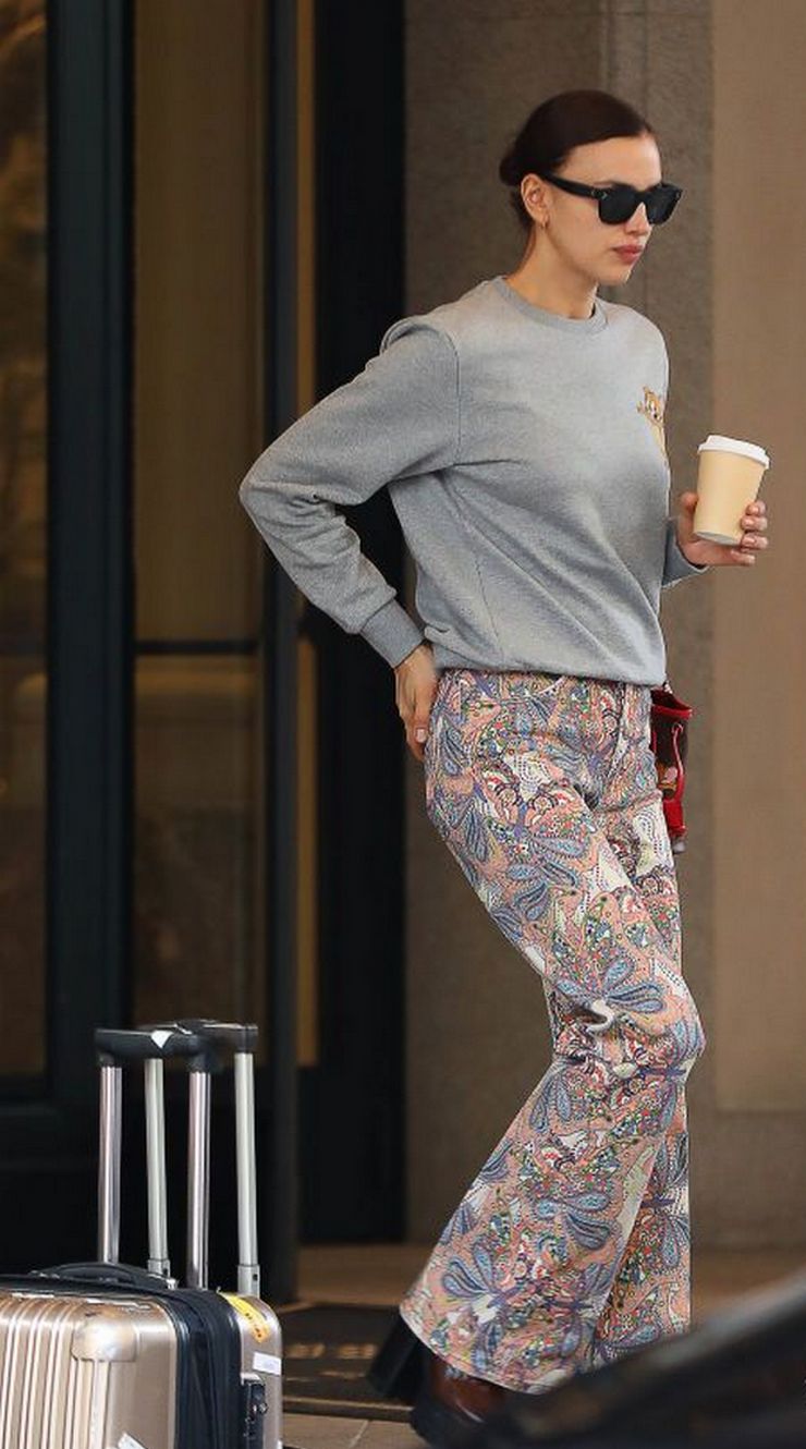 Теперь же Ирину засняли фоторепортеры во время прогулки по городу. Модель предпочла одеть удобную одежду: серую толстовку с мультяшным мышонком Джерри, брюками клеш и модных сапогах на тракторной подошве. Сумочка, которую держала Шейк в руках также имела рисунок с мышкой. Стоит отметить, что модель прогуливалась не одна, а с мужчиной по имени Али Кавусси. В СМИ сообщается, что это ее агент и он открытый гей.