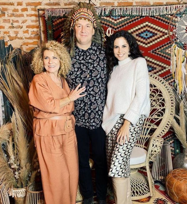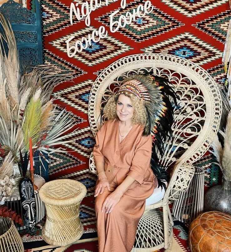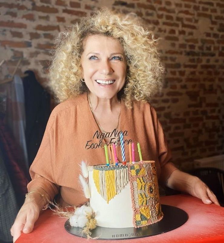 На празднике была необычная зона для фотографирования с разноцветными ковриками с орнаментом, большим креслом и другими декорациями. Именинница позировала в головном уборе из перьев, как у индейцев. На виновнице торжества был одет брючный костюм. Сфотографировалась Лидия Петровна и с необычным именинным тортиком.