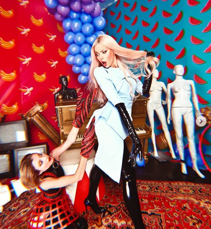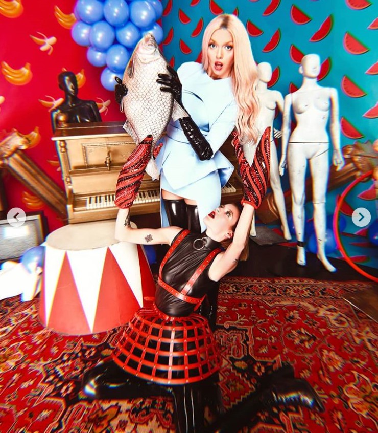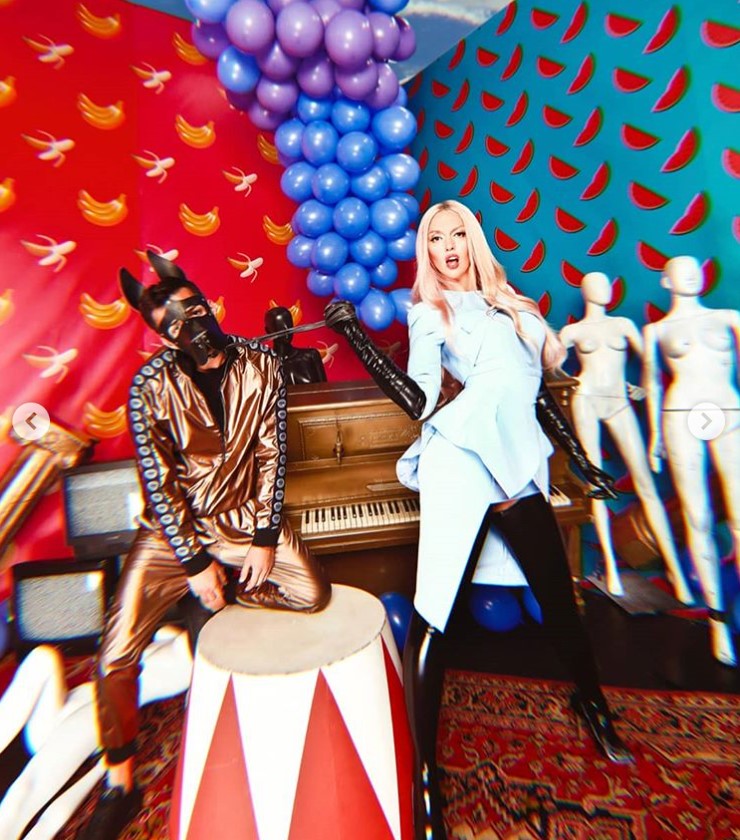 У себя в Инста-блоге исполнительница сообщила, что принимала участие в фотосъемке вместе с участниками известного реалити-шоу “Топ-модель по-украински”. Полякова на снимках предстает в латексных сапогах-чулках на шпильке и высоких перчатках, голубеньком костюмчике, а также с хлыстом в руках. Остальные участники фотосессии также были в латексных нарядах, причем их лица скрывались за масками животных.