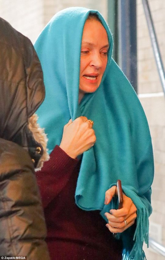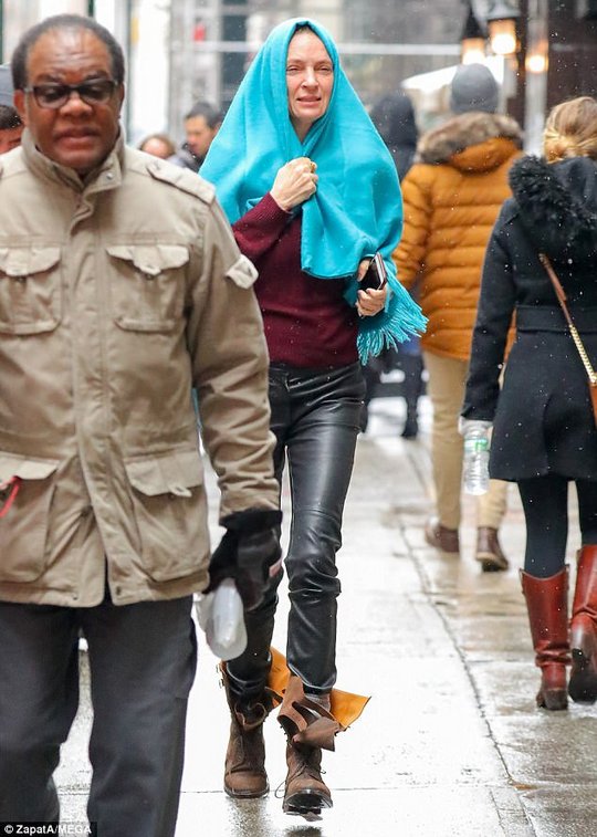 Судя по всему, знаменитая 47-летняя актриса направлялась по делам, когда ее неожиданно застал дождь. Пытаясь защититься от дождя Ума завернулась в ярко-синий шарф, превратив его в своеобразное пончо от дождя. Для своей прогулки она выбрала черные кожаные брюки и бордовый верх, дополнив их расстёгнутыми сапогами. Знаменитость была полностью без макияжа и сжимала в своих руках телефон, когда пробиралась по улицам сквозь толпу. В женщине с трудом можно было узнать секс-символ Голливуда, который многие годы будоражит воображение мужчин всего мира.