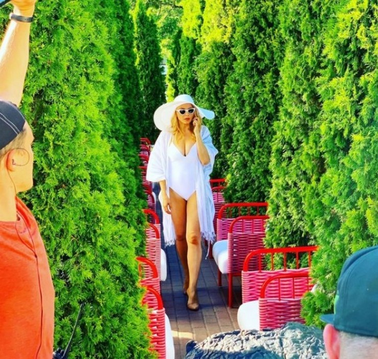 “Сегодня проходил еще один прекрасный съемочный день в кинопроекте, название которого пока держится в секрете… Когда еще б у меня была возможность покупаться в бассейне в самый разгар рабочего дня?))) Когда бы еще можно было прийти на работу в купальнике и шляпе? Только в кино! Только в кино актрисы под купальник одевают туфли на шпильке”.
