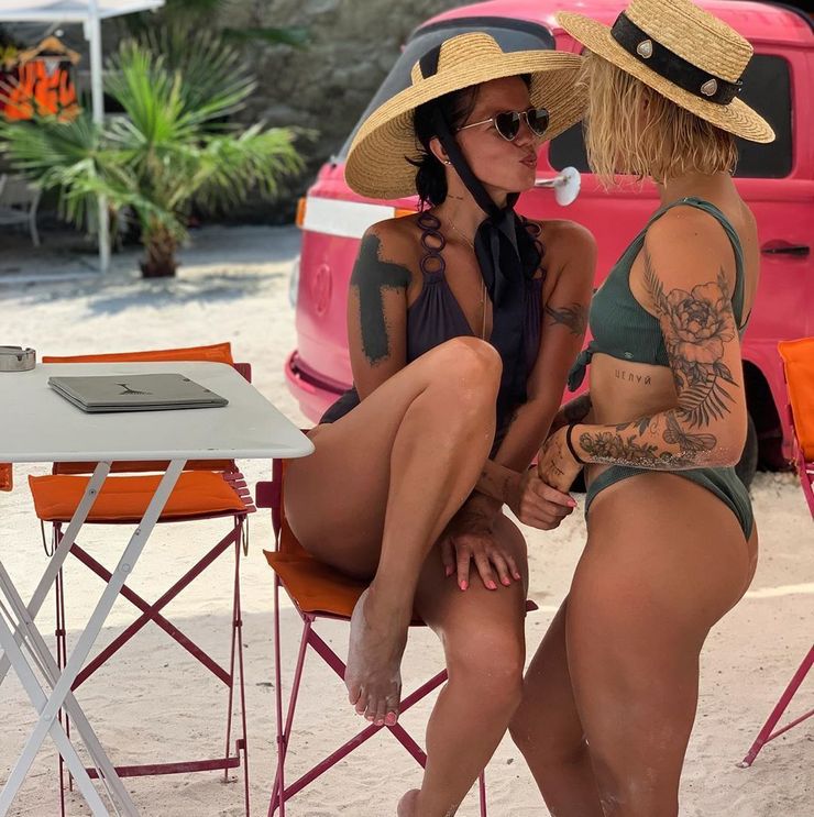 На этот раз Ирина Демичева выложила у себя в Инстаграме фотоснимок, который подтверждает, что на отдыхе с семейством Монатика находятся экс-жена Потапа Ирина Горовая с дочкой Наташей. Демичева у себя на странице выложила снимок, на котором она с Ириной и ее дочкой засняты на фоне малинового авто по продаже коктейлей в купальниках.